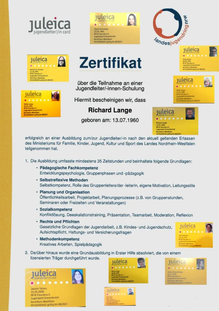 Die Ausbildung zum/r JugendleiterIn ist ab 16 Jahren möglich. Die Ausbildung erfordert keine Prüfung, aber die Ausbildung muss alle zwei Jahre aufgefrischt werden, um den Status des/r juleica-Ausbilders/in zu erhalten. Wir führen die jungen Menschen langsam an ihre Aufgaben heran und ermöglichen ihnen so, mit den Aufgaben zu wachsen. Gleichzeitig bilden wir damit aber auch Nachwuchs für das Ehrenamt aus und ermöglichen den Inhabern/Innen der Jugendleitercard, bei uns eigene Gruppen zu leiten. Zudem helfen unsere JugendleiterInnen auch bei anderen Vereinen Seltener Erkrankungen aus. Des Weiteren können Sie ihre Juleica auch bei Sportund sonstigen Vereinen einsetzen, so dass sie möglichst viel praktische Erfahrung sammeln können.